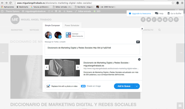 En la imagen superior puedes ver el icono de Buffer en la parte superior izquierda. Cuando estás navegando por internet únicamente tienes que clickar sobre el icono para compartir el enlace en tus redes sociales favoritas o bien para programar el post. Finalmente una de las principales ventajas que nos ofrece Buffer es la posibilidad de acceder a estadísticas sobre los artículos que has compartido a través de esta completa y sencilla aplicación.